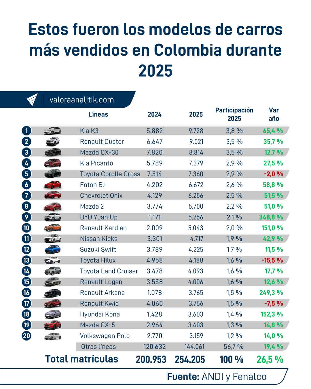 En el acumulado de todo el año, Kia se posicionó como el número uno en Colombia con 34.063 unidades y un crecimiento del 40,7 %. Por su parte, Renault ocupó el segundo lugar con 33.658 registros, un 33 % más que en 2024.